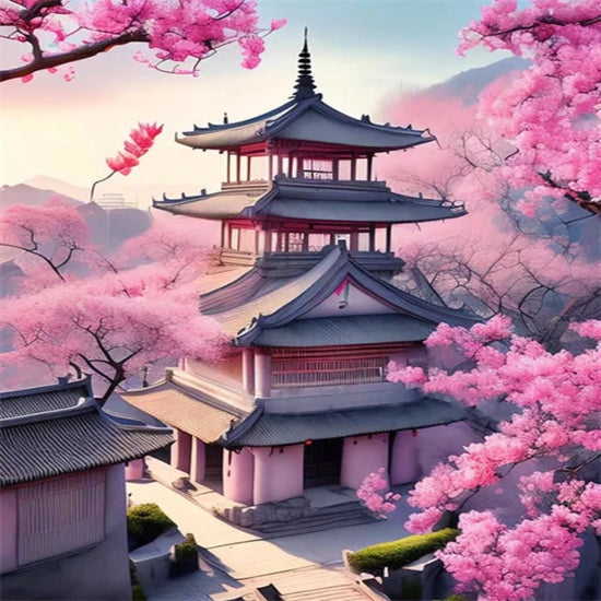 Japanese Temple Cherry Blossom Scenery Paint by Numbers