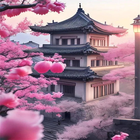 Lovely Cherry Blossom Japanese Temple Paint by Numbers
